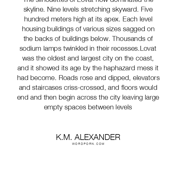 The silhouettes of Lovat now dominated the skyline. Nine levels stretching skyward. Five hundred meters high at its apex. Each level housing buildings of various sizes sagged on the backs of buildings below. Thousands of sodium lamps twinkled in their recesses.Lovat was the oldest and largest city on the coast, and it showed its age by the haphazard mess it had become. Roads rose and dipped, elevators and staircases criss-crossed, and floors would end and then begin across the city leaving large empty spaces between levels