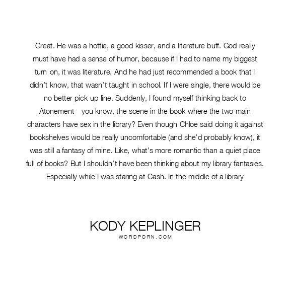 Great. He was a hottie, a good kisser, and a literature buff. God really must have had a sense of humor, because if I had to name my biggest turn-on, it was literature. And he had just recommended a book that I didn’t know, that wasn’t taught in school. If I were single, there would be no better pick-up line. Suddenly, I found myself thinking back to Atonement—you know, the scene in the book where the two main characters have sex in the library? Even though Chloe said doing it against bookshelves would be really uncomfortable (and she’d probably know), it was still a fantasy of mine. Like, what’s more romantic than a quiet place full of books? But I shouldn’t have been thinking about my library fantasies. Especially while I was staring at Cash. In the middle of a library