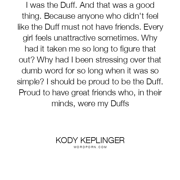 I was the Duff. And that was a good thing. Because anyone who didn't feel like the Duff must not have friends. Every girl feels unattractive sometimes. Why had it taken me so long to figure that out? Why had I been stressing over that dumb word for so long when it was so simple? I should be proud to be the Duff. Proud to have great friends who, in their minds, were my Duffs