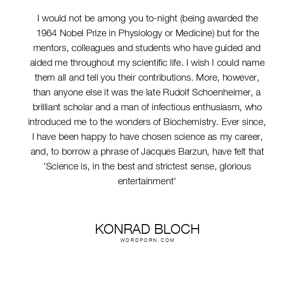I would not be among you to-night (being awarded the 1964 Nobel Prize in Physiology or Medicine) but for the mentors, colleagues and students who have guided and aided me throughout my scientific life. I wish I could name them all and tell you their contributions. More, however, than anyone else it was the late Rudolf Schoenheimer, a brilliant scholar and a man of infectious enthusiasm, who introduced me to the wonders of Biochemistry. Ever since, I have been happy to have chosen science as my career, and, to borrow a phrase of Jacques Barzun, have felt that 'Science is, in the best and strictest sense, glorious entertainment'