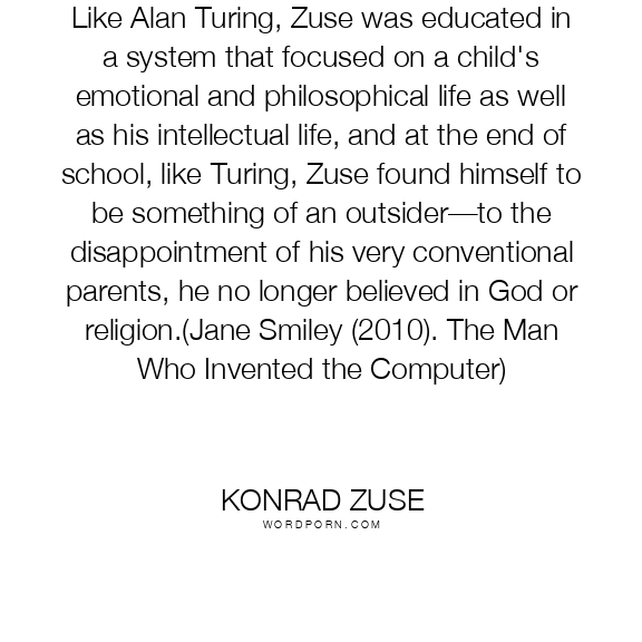 Like Alan Turing, Zuse was educated in a system that focused on a child's emotional and philosophical life as well as his intellectual life, and at the end of school, like Turing, Zuse found himself to be something of an outsider—to the disappointment of his very conventional parents, he no longer believed in God or religion.(Jane Smiley (2010). The Man Who Invented the Computer)