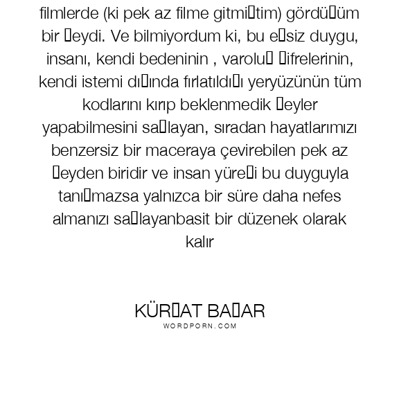Evet, aşk benim için kitaplarda okuduğum, filmlerde (ki pek az filme gitmiştim) gördüğüm bir şeydi. Ve bilmiyordum ki, bu eşsiz duygu, insanı, kendi bedeninin , varoluş şifrelerinin, kendi istemi dışında fırlatıldığı yeryüzünün tüm kodlarını kırıp beklenmedik şeyler yapabilmesini sağlayan, sıradan hayatlarımızı benzersiz bir maceraya çevirebilen pek az şeyden biridir ve insan yüreği bu duyguyla tanışmazsa yalnızca bir süre daha nefes almanızı sağlayanbasit bir düzenek olarak kalır