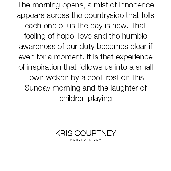 The morning opens, a mist of innocence appears across the countryside that tells each one of us the day is new. That feeling of hope, love and the humble awareness of our duty becomes clear if even for a moment. It is that experience of inspiration that follows us into a small town woken by a cool frost on this Sunday morning and the laughter of children playing