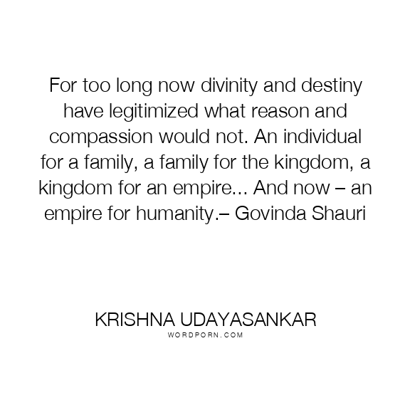 For too long now divinity and destiny have legitimized what reason and compassion would not. An individual for a family, a family for the kingdom, a kingdom for an empire... And now – an empire for humanity.– Govinda Shauri