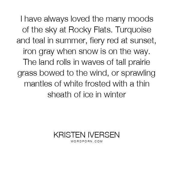 I have always loved the many moods of the sky at Rocky Flats. Turquoise and teal in summer, fiery red at sunset, iron gray when snow is on the way. The land rolls in waves of tall prairie grass bowed to the wind, or sprawling mantles of white frosted with a thin sheath of ice in winter