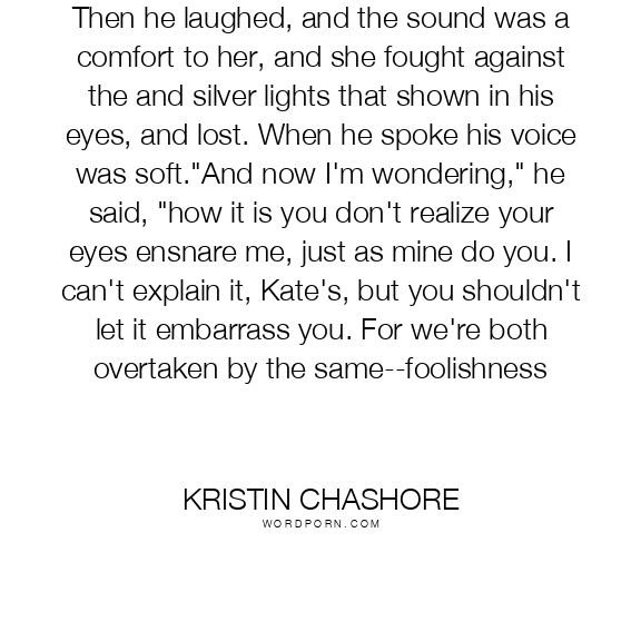 Then he laughed, and the sound was a comfort to her, and she fought against the and silver lights that shown in his eyes, and lost. When he spoke his voice was soft."And now I'm wondering," he said, "how it is you don't realize your eyes ensnare me, just as mine do you. I can't explain it, Kate's, but you shouldn't let it embarrass you. For we're both overtaken by the same--foolishness