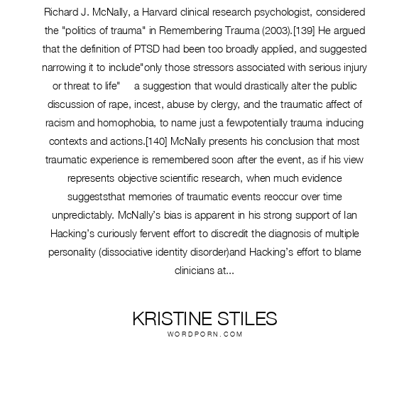 Richard J. McNally, a Harvard clinical research psychologist, considered the "politics of trauma" in Remembering Trauma (2003).[139] He argued that the definition of PTSD had been too broadly applied, and suggested narrowing it to include"only those stressors associated with serious injury or threat to life" —a suggestion that would drastically alter the public discussion of rape, incest, abuse by clergy, and the traumatic affect of racism and homophobia, to name just a fewpotentially trauma-inducing contexts and actions.[140] McNally presents his conclusion that most traumatic experience is remembered soon after the event, as if his view represents objective scientific research, when much evidence suggeststhat memories of traumatic events reoccur over time unpredictably. McNally’s bias is apparent in his strong support of Ian Hacking’s curiously fervent effort to discredit the diagnosis of multiple personality (dissociative identity disorder)and Hacking’s effort to blame clinicians attached to recovered memory therapy of the spurious "rewriting" of patients’ "souls."[141] While McNally accounts for those who do recall their traumas, he does not equally offer an explanation for those who do not remember them, and his extensive bibliography and research do not cite key publications that would challenge his results.[142] - Page 19
