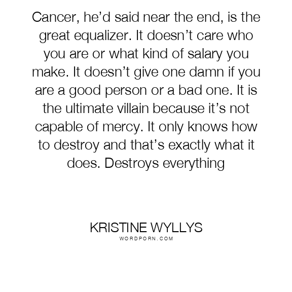 Cancer, he’d said near the end, is the great equalizer. It doesn’t care who you are or what kind of salary you make. It doesn’t give one damn if you are a good person or a bad one. It is the ultimate villain because it’s not capable of mercy. It only knows how to destroy and that’s exactly what it does. Destroys everything
