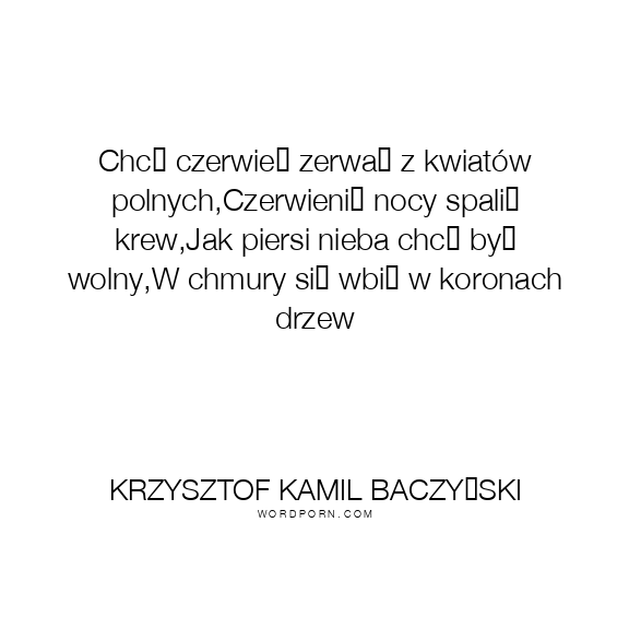 Copy Image Chcę czerwień zerwać z kwiatów polnych,Czerwienią nocy spalić krew,Jak piersi nieba chcę być wolny,W chmury się wbić w koronach drzew Moms Typewriter A A SAVE THIS IMAGE