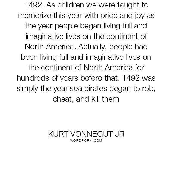 1492. As children we were taught to memorize this year with pride and joy as the year people began living full and imaginative lives on the continent of North America. Actually, people had been living full and imaginative lives on the continent of North America for hundreds of years before that. 1492 was simply the year sea pirates began to rob, cheat, and kill them