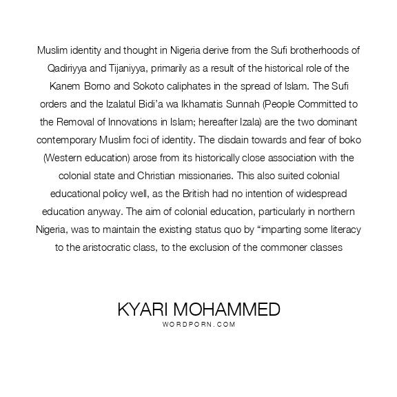 Muslim identity and thought in Nigeria derive from the Sufi brotherhoods of Qadiriyya and Tijaniyya, primarily as a result of the historical role of the Kanem-Borno and Sokoto caliphates in the spread of Islam. The Sufi orders and the Izalatul Bidi’a wa Ikhamatis Sunnah (People Committed to the Removal of Innovations in Islam; hereafter Izala) are the two dominant contemporary Muslim foci of identity. The disdain towards and fear of boko (Western education) arose from its historically close association with the colonial state and Christian missionaries. This also suited colonial educational policy well, as the British had no intention of widespread education anyway. The aim of colonial education, particularly in northern Nigeria, was to maintain the existing status quo by “imparting some literacy to the aristocratic class, to the exclusion of the commoner classes
