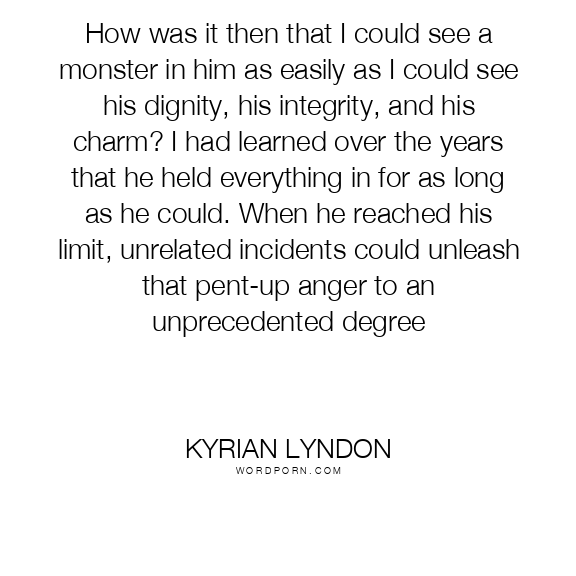 How was it then that I could see a monster in him as easily as I could see his dignity, his integrity, and his charm? I had learned over the years that he held everything in for as long as he could. When he reached his limit, unrelated incidents could unleash that pent-up anger to an unprecedented degree