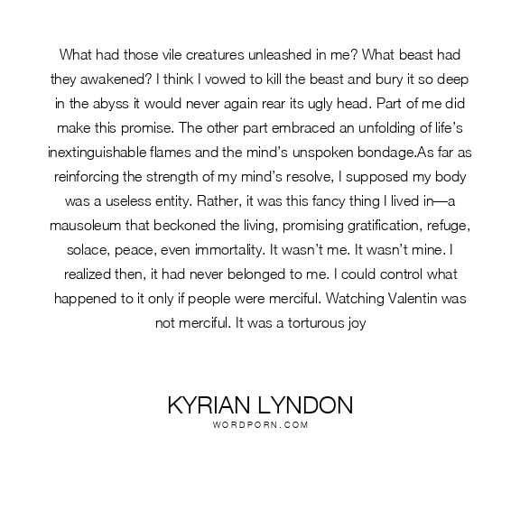 What had those vile creatures unleashed in me? What beast had they awakened? I think I vowed to kill the beast and bury it so deep in the abyss it would never again rear its ugly head. Part of me did make this promise. The other part embraced an unfolding of life’s inextinguishable flames and the mind’s unspoken bondage.As far as reinforcing the strength of my mind’s resolve, I supposed my body was a useless entity. Rather, it was this fancy thing I lived in—a mausoleum that beckoned the living, promising gratification, refuge, solace, peace, even immortality. It wasn’t me. It wasn’t mine. I realized then, it had never belonged to me. I could control what happened to it only if people were merciful. Watching Valentin was not merciful. It was a torturous joy