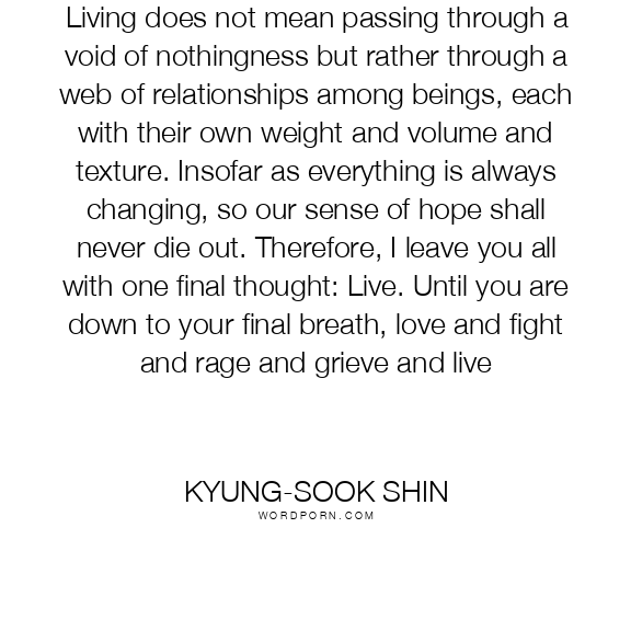 Living does not mean passing through a void of nothingness but rather through a web of relationships among beings, each with their own weight and volume and texture. Insofar as everything is always changing, so our sense of hope shall never die out. Therefore, I leave you all with one final thought: Live. Until you are down to your final breath, love and fight and rage and grieve and live