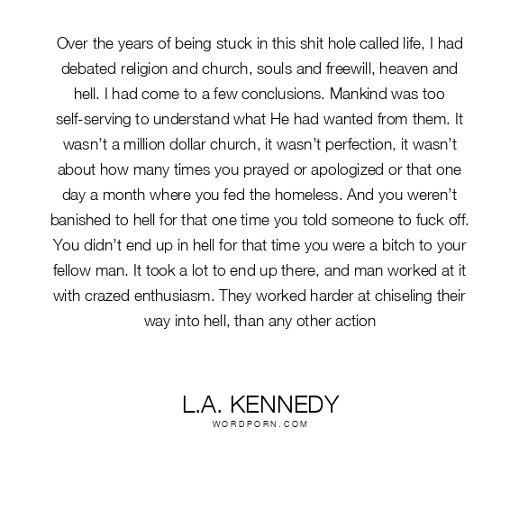 Over the years of being stuck in this shit hole called life, I had debated religion and church, souls and freewill, heaven and hell. I had come to a few conclusions. Mankind was too self-serving to understand what He had wanted from them. It wasn’t a million dollar church, it wasn’t perfection, it wasn’t about how many times you prayed or apologized or that one day a month where you fed the homeless. And you weren’t banished to hell for that one time you told someone to fuck off. You didn’t end up in hell for that time you were a bitch to your fellow man. It took a lot to end up there, and man worked at it with crazed enthusiasm. They worked harder at chiseling their way into hell, than any other action