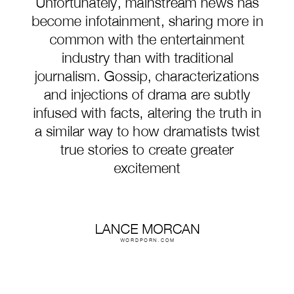 Unfortunately, mainstream news has become infotainment, sharing more in common with the entertainment industry than with traditional journalism. Gossip, characterizations and injections of drama are subtly infused with facts, altering the truth in a similar way to how dramatists twist true stories to create greater excitement