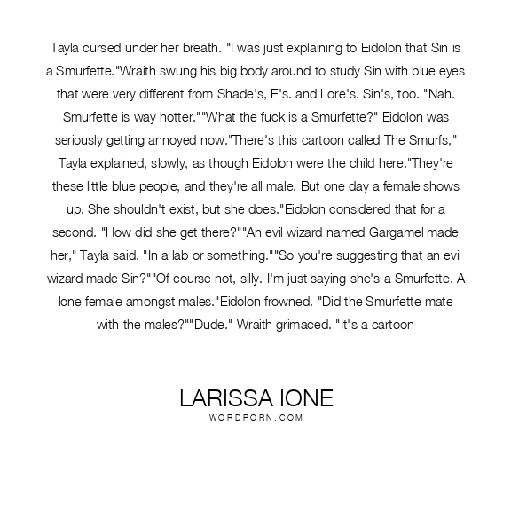 Tayla cursed under her breath. "I was just explaining to Eidolon that Sin is a Smurfette."Wraith swung his big body around to study Sin with blue eyes that were very different from Shade's, E's. and Lore's. Sin's, too. "Nah. Smurfette is way hotter.""What the fuck is a Smurfette?" Eidolon was seriously getting annoyed now."There's this cartoon called The Smurfs," Tayla explained, slowly, as though Eidolon were the child here."They're these little blue people, and they're all male. But one day a female shows up. She shouldn't exist, but she does."Eidolon considered that for a second. "How did she get there?""An evil wizard named Gargamel made her," Tayla said. "In a lab or something.""So you're suggesting that an evil wizard made Sin?""Of course not, silly. I'm just saying she's a Smurfette. A lone female amongst males."Eidolon frowned. "Did the Smurfette mate with the males?""Dude." Wraith grimaced. "It's a cartoon