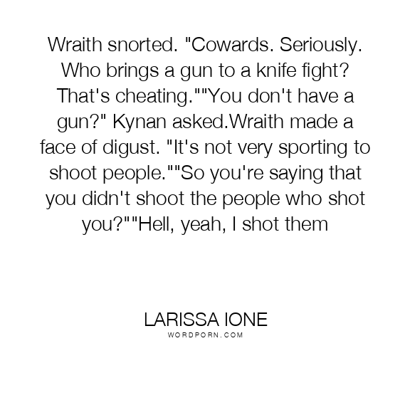Wraith snorted. "Cowards. Seriously. Who brings a gun to a knife fight? That's cheating.""You don't have a gun?" Kynan asked.Wraith made a face of digust. "It's not very sporting to shoot people.""So you're saying that you didn't shoot the people who shot you?""Hell, yeah, I shot them