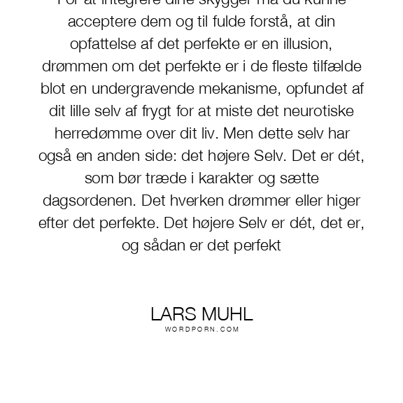 For at integrere dine skygger må du kunne acceptere dem og til fulde forstå, at din opfattelse af det perfekte er en illusion, drømmen om det perfekte er i de fleste tilfælde blot en undergravende mekanisme, opfundet af dit lille selv af frygt for at miste det neurotiske herredømme over dit liv. Men dette selv har også en anden side: det højere Selv. Det er dét, som bør træde i karakter og sætte dagsordenen. Det hverken drømmer eller higer efter det perfekte. Det højere Selv er dét, det er, og sådan er det perfekt