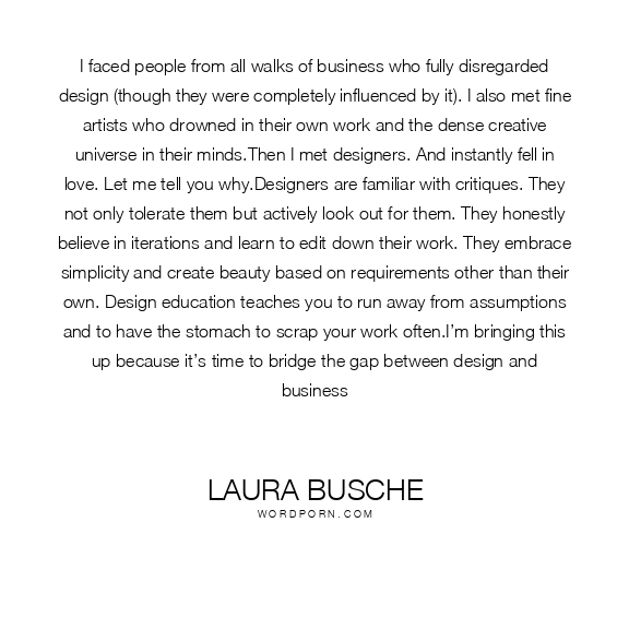 I faced people from all walks of business who fully disregarded design (though they were completely influenced by it). I also met fine artists who drowned in their own work and the dense creative universe in their minds.Then I met designers. And instantly fell in love. Let me tell you why.Designers are familiar with critiques. They not only tolerate them but actively look out for them. They honestly believe in iterations and learn to edit down their work. They embrace simplicity and create beauty based on requirements other than their own. Design education teaches you to run away from assumptions and to have the stomach to scrap your work often.I’m bringing this up because it’s time to bridge the gap between design and business