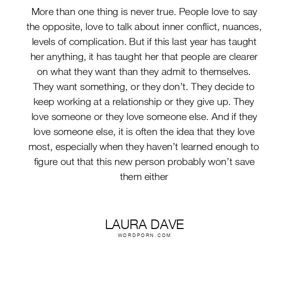 More than one thing is never true. People love to say the opposite, love to talk about inner conflict, nuances, levels of complication. But if this last year has taught her anything, it has taught her that people are clearer on what they want than they admit to themselves. They want something, or they don’t. They decide to keep working at a relationship or they give up. They love someone or they love someone else. And if they love someone else, it is often the idea that they love most, especially when they haven’t learned enough to figure out that this new person probably won’t save them either