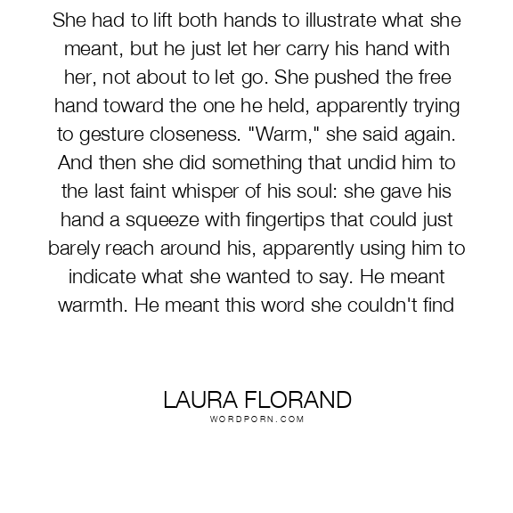 She had to lift both hands to illustrate what she meant, but he just let her carry his hand with her, not about to let go. She pushed the free hand toward the one he held, apparently trying to gesture closeness. "Warm," she said again. And then she did something that undid him to the last faint whisper of his soul: she gave his hand a squeeze with fingertips that could just barely reach around his, apparently using him to indicate what she wanted to say. He meant warmth. He meant this word she couldn't find