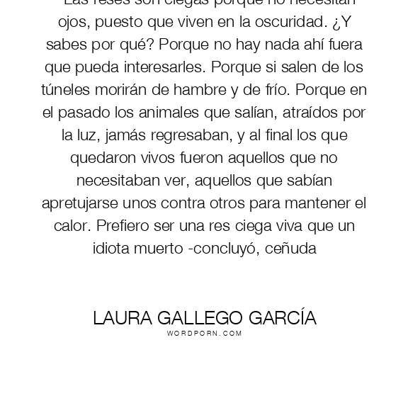 - Las reses son ciegas porque no necesitan ojos, puesto que viven en la oscuridad. ¿Y sabes por qué? Porque no hay nada ahí fuera que pueda interesarles. Porque si salen de los túneles morirán de hambre y de frío. Porque en el pasado los animales que salían, atraídos por la luz, jamás regresaban, y al final los que quedaron vivos fueron aquellos que no necesitaban ver, aquellos que sabían apretujarse unos contra otros para mantener el calor. Prefiero ser una res ciega viva que un idiota muerto -concluyó, ceñuda