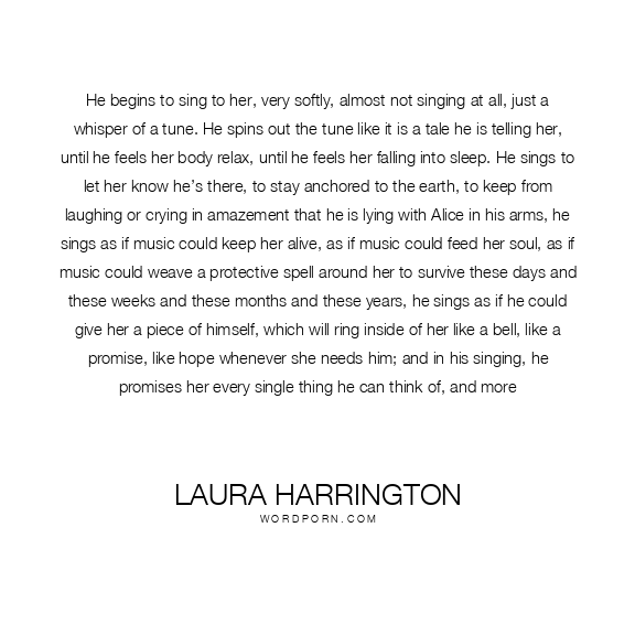 He begins to sing to her, very softly, almost not singing at all, just a whisper of a tune. He spins out the tune like it is a tale he is telling her, until he feels her body relax, until he feels her falling into sleep. He sings to let her know he’s there, to stay anchored to the earth, to keep from laughing or crying in amazement that he is lying with Alice in his arms, he sings as if music could keep her alive, as if music could feed her soul, as if music could weave a protective spell around her to survive these days and these weeks and these months and these years, he sings as if he could give her a piece of himself, which will ring inside of her like a bell, like a promise, like hope whenever she needs him; and in his singing, he promises her every single thing he can think of, and more
