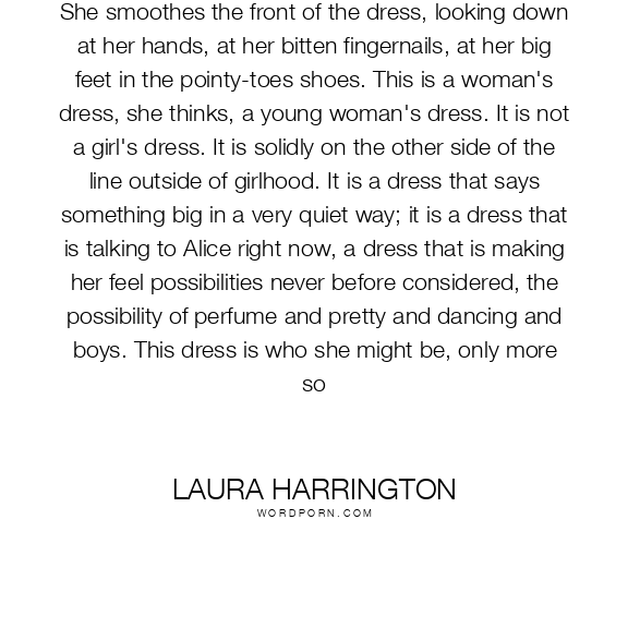 She smoothes the front of the dress, looking down at her hands, at her bitten fingernails, at her big feet in the pointy-toes shoes. This is a woman's dress, she thinks, a young woman's dress. It is not a girl's dress. It is solidly on the other side of the line outside of girlhood. It is a dress that says something big in a very quiet way; it is a dress that is talking to Alice right now, a dress that is making her feel possibilities never before considered, the possibility of perfume and pretty and dancing and boys. This dress is who she might be, only more so