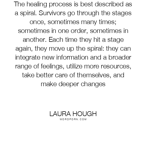 The healing process is best described as a spiral. Survivors go through the stages once, sometimes many times; sometimes in one order, sometimes in another. Each time they hit a stage again, they move up the spiral: they can integrate new information and a broader range of feelings, utilize more resources, take better care of themselves, and make deeper changes