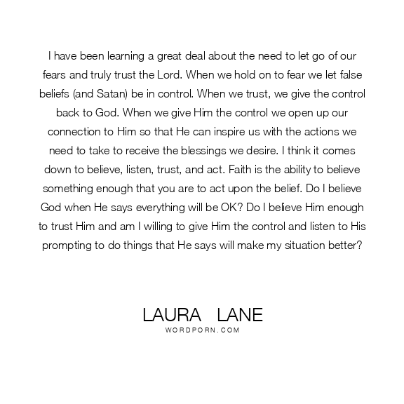 I have been learning a great deal about the need to let go of our fears and truly trust the Lord. When we hold on to fear we let false beliefs (and Satan) be in control. When we trust, we give the control back to God. When we give Him the control we open up our connection to Him so that He can inspire us with the actions we need to take to receive the blessings we desire. I think it comes down to believe, listen, trust, and act. Faith is the ability to believe something enough that you are to act upon the belief. Do I believe God when He says everything will be OK? Do I believe Him enough to trust Him and am I willing to give Him the control and listen to His prompting to do things that He says will make my situation better?