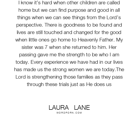 I know it’s hard when other children are called home but we can find purpose and good in all things when we can see things from the Lord’s perspective. There is goodness to be found and lives are still touched and changed for the good when little ones go home to Heavenly Father. My sister was 7 when she returned to him. Her passing gave me the strength to be who I am today. Every experience we have had in our lives has made us the strong women we are today.The Lord is strengthening those families as they pass through these trials just as He does us