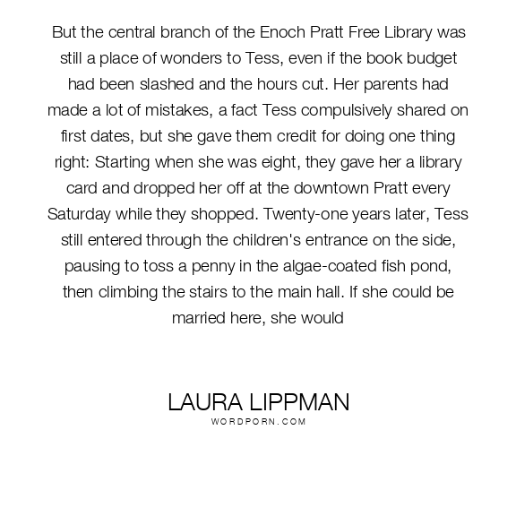 But the central branch of the Enoch Pratt Free Library was still a place of wonders to Tess, even if the book budget had been slashed and the hours cut. Her parents had made a lot of mistakes, a fact Tess compulsively shared on first dates, but she gave them credit for doing one thing right: Starting when she was eight, they gave her a library card and dropped her off at the downtown Pratt every Saturday while they shopped. Twenty-one years later, Tess still entered through the children's entrance on the side, pausing to toss a penny in the algae-coated fish pond, then climbing the stairs to the main hall. If she could be married here, she would