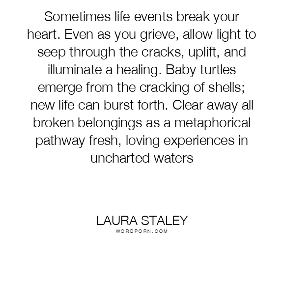 Sometimes life events break your heart. Even as you grieve, allow light to seep through the cracks, uplift, and illuminate a healing. Baby turtles emerge from the cracking of shells; new life can burst forth. Clear away all broken belongings as a metaphorical pathway fresh, loving experiences in uncharted waters