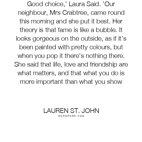 Good choice,' Laura Said. 'Our neighbour, Mrs Crabtree, came round this morning and she put it best. Her theory is that fame is like a bubble. It looks gorgeous on the outside, as if it's been painted with pretty colours, but when you pop it there's nothing there. She said that life, love and friendship are what matters, and that what you do is more important than what you show