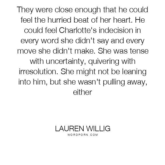 They were close enough that he could feel the hurried beat of her heart. He could feel Charlotte's indecision in every word she didn't say and every move she didn't make. She was tense with uncertainty, quivering with irresolution. She might not be leaning into him, but she wasn't pulling away, either