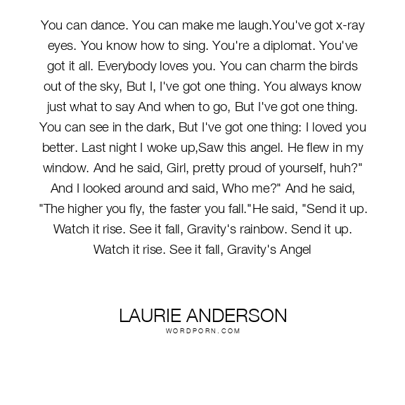 You can dance. You can make me laugh.You've got x-ray eyes. You know how to sing. You're a diplomat. You've got it all. Everybody loves you. You can charm the birds out of the sky, But I, I've got one thing. You always know just what to say And when to go, But I've got one thing. You can see in the dark, But I've got one thing: I loved you better. Last night I woke up,Saw this angel. He flew in my window. And he said, Girl, pretty proud of yourself, huh?" And I looked around and said, Who me?" And he said, "The higher you fly, the faster you fall."He said, "Send it up. Watch it rise. See it fall, Gravity's rainbow. Send it up. Watch it rise. See it fall, Gravity's Angel