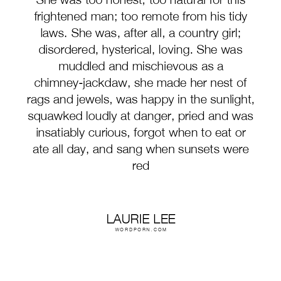 She was too honest, too natural for this frightened man; too remote from his tidy laws. She was, after all, a country girl; disordered, hysterical, loving. She was muddled and mischievous as a chimney-jackdaw, she made her nest of rags and jewels, was happy in the sunlight, squawked loudly at danger, pried and was insatiably curious, forgot when to eat or ate all day, and sang when sunsets were red