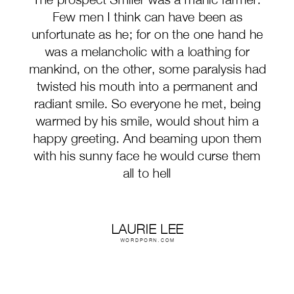 The prospect Smiler was a manic farmer. Few men I think can have been as unfortunate as he; for on the one hand he was a melancholic with a loathing for mankind, on the other, some paralysis had twisted his mouth into a permanent and radiant smile. So everyone he met, being warmed by his smile, would shout him a happy greeting. And beaming upon them with his sunny face he would curse them all to hell