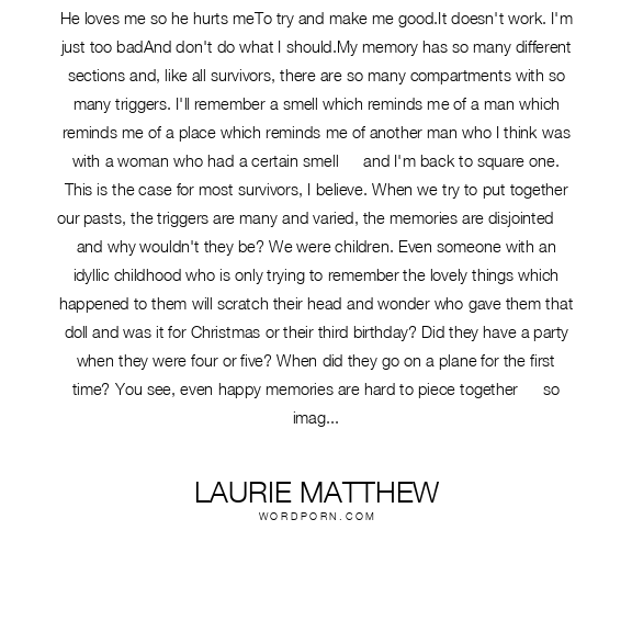 He loves me so he hurts meTo try and make me good.It doesn't work. I'm just too badAnd don't do what I should.My memory has so many different sections and, like all survivors, there are so many compartments with so many triggers. I'll remember a smell which reminds me of a man which reminds me of a place which reminds me of another man who I think was with a woman who had a certain smell — and I'm back to square one. This is the case for most survivors, I believe. When we try to put together our pasts, the triggers are many and varied, the memories are disjointed — and why wouldn't they be? We were children. Even someone with an idyllic childhood who is only trying to remember the lovely things which happened to them will scratch their head and wonder who gave them that doll and was it for Christmas or their third birthday? Did they have a party when they were four or five? When did they go on a plane for the first time? You see, even happy memories are hard to piece together — so imagine how hard it is to collate all of the trauma, to pull together all of the things I've been trying to push away for so many years