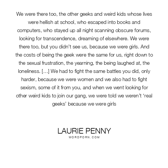 We were there too, the other geeks and weird kids whose lives were hellish at school, who escaped into books and computers, who stayed up all night scanning obscure forums, looking for transcendence, dreaming of elsewhere. We were there too, but you didn’t see us, because we were girls. And the costs of being the geek were the same for us, right down to the sexual frustration, the yearning, the being laughed at, the loneliness. […] We had to fight the same battles you did, only harder, because we were women and we also had to fight sexism, some of it from you, and when we went looking for other weird kids to join our gang, we were told we weren’t ‘real geeks’ because we were girls