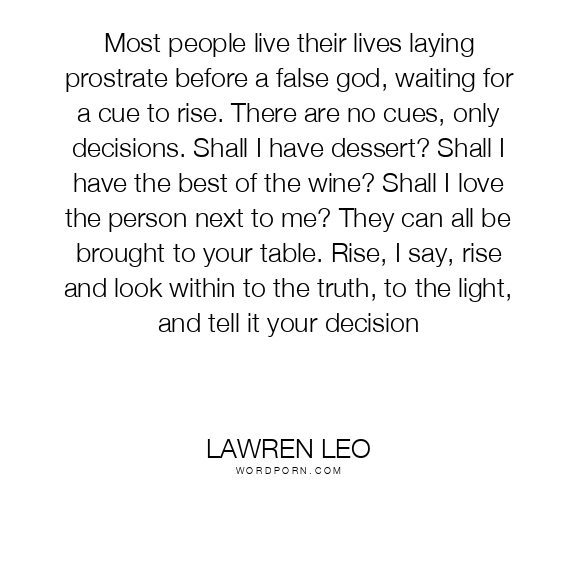 Most people live their lives laying prostrate before a false god, waiting for a cue to rise. There are no cues, only decisions. Shall I have dessert? Shall I have the best of the wine? Shall I love the person next to me? They can all be brought to your table. Rise, I say, rise and look within to the truth, to the light, and tell it your decision