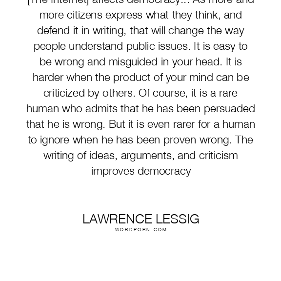 [The Internet] affects democracy... As more and more citizens express what they think, and defend it in writing, that will change the way people understand public issues. It is easy to be wrong and misguided in your head. It is harder when the product of your mind can be criticized by others. Of course, it is a rare human who admits that he has been persuaded that he is wrong. But it is even rarer for a human to ignore when he has been proven wrong. The writing of ideas, arguments, and criticism improves democracy