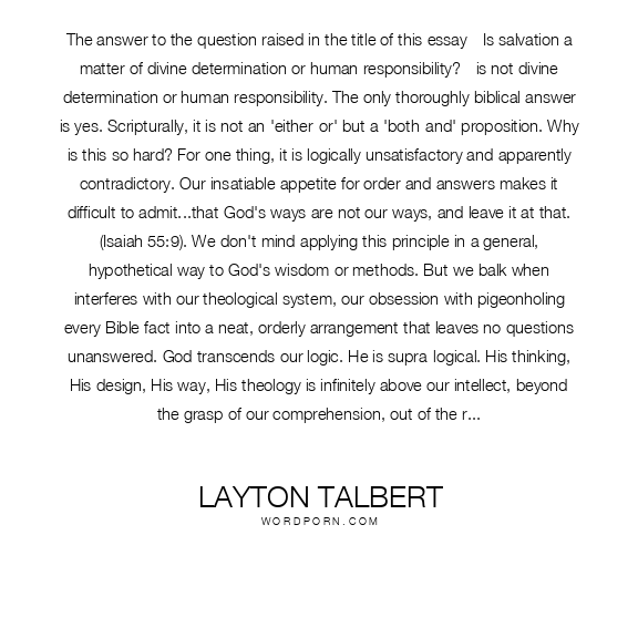 The answer to the question raised in the title of this essay - Is salvation a matter of divine determination or human responsibility? - is not divine determination or human responsibility. The only thoroughly biblical answer is yes. Scripturally, it is not an 'either-or' but a 'both-and' proposition. Why is this so hard? For one thing, it is logically unsatisfactory and apparently contradictory. Our insatiable appetite for order and answers makes it difficult to admit...that God's ways are not our ways, and leave it at that. (Isaiah 55:9). We don't mind applying this principle in a general, hypothetical way to God's wisdom or methods. But we balk when interferes with our theological system, our obsession with pigeonholing every Bible fact into a neat, orderly arrangement that leaves no questions unanswered. God transcends our logic. He is supra-logical. His thinking, His design, His way, His theology is infinitely above our intellect, beyond the grasp of our comprehension, out of the reach of our clever rationalizations. God is theo-logical. Man is anthropo-logical