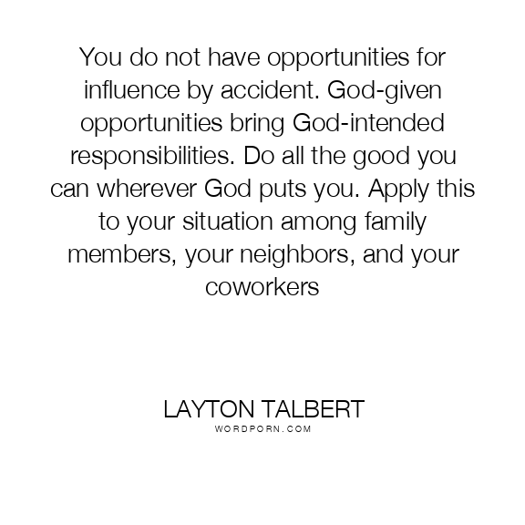 You do not have opportunities for influence by accident. God-given opportunities bring God-intended responsibilities. Do all the good you can wherever God puts you. Apply this to your situation among family members, your neighbors, and your coworkers