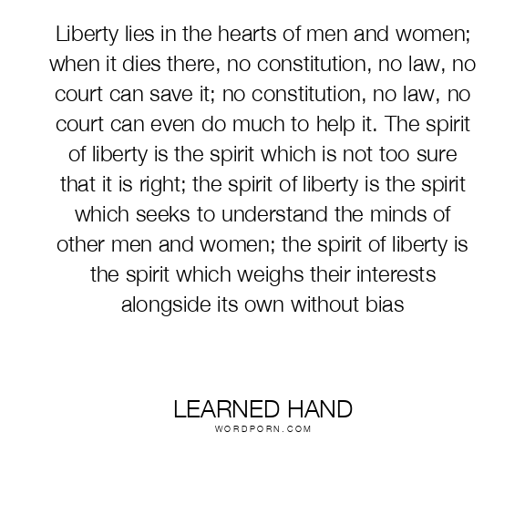Liberty lies in the hearts of men and women; when it dies there, no constitution, no law, no court can save it; no constitution, no law, no court can even do much to help it. The spirit of liberty is the spirit which is not too sure that it is right; the spirit of liberty is the spirit which seeks to understand the minds of other men and women; the spirit of liberty is the spirit which weighs their interests alongside its own without bias
