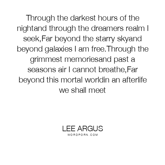 Through the darkest hours of the nightand through the dreamers realm I seek,Far beyond the starry skyand beyond galaxies I am free.Through the grimmest memoriesand past a seasons air I cannot breathe,Far beyond this mortal worldin an afterlife we shall meet