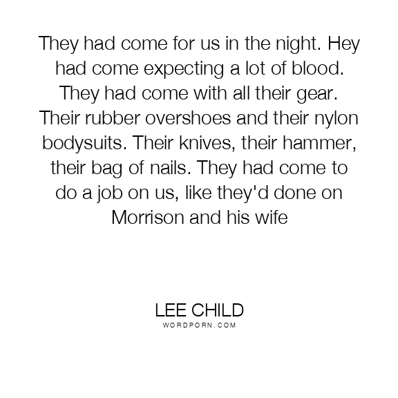 They had come for us in the night. Hey had come expecting a lot of blood. They had come with all their gear. Their rubber overshoes and their nylon bodysuits. Their knives, their hammer, their bag of nails. They had come to do a job on us, like they'd done on Morrison and his wife