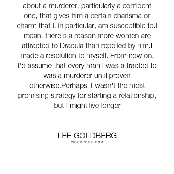 I had to wonder, though, if there's something about a murderer, particularly a confident one, that gives him a certain charisma or charm that I, in particular, am susceptible to.I mean, there's a reason more women are attracted to Dracula than repelled by him.I made a resolution to myself. From now on, I'd assume that every man I was attracted to was a murderer until proven otherwise.Perhaps it wasn't the most promising strategy for starting a relationship, but I might live longer