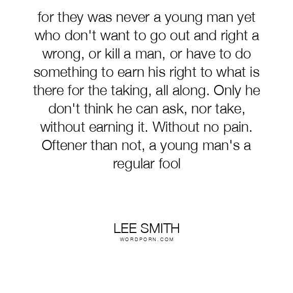 for they was never a young man yet who don't want to go out and right a wrong, or kill a man, or have to do something to earn his right to what is there for the taking, all along. Only he don't think he can ask, nor take, without earning it. Without no pain. Oftener than not, a young man's a regular fool